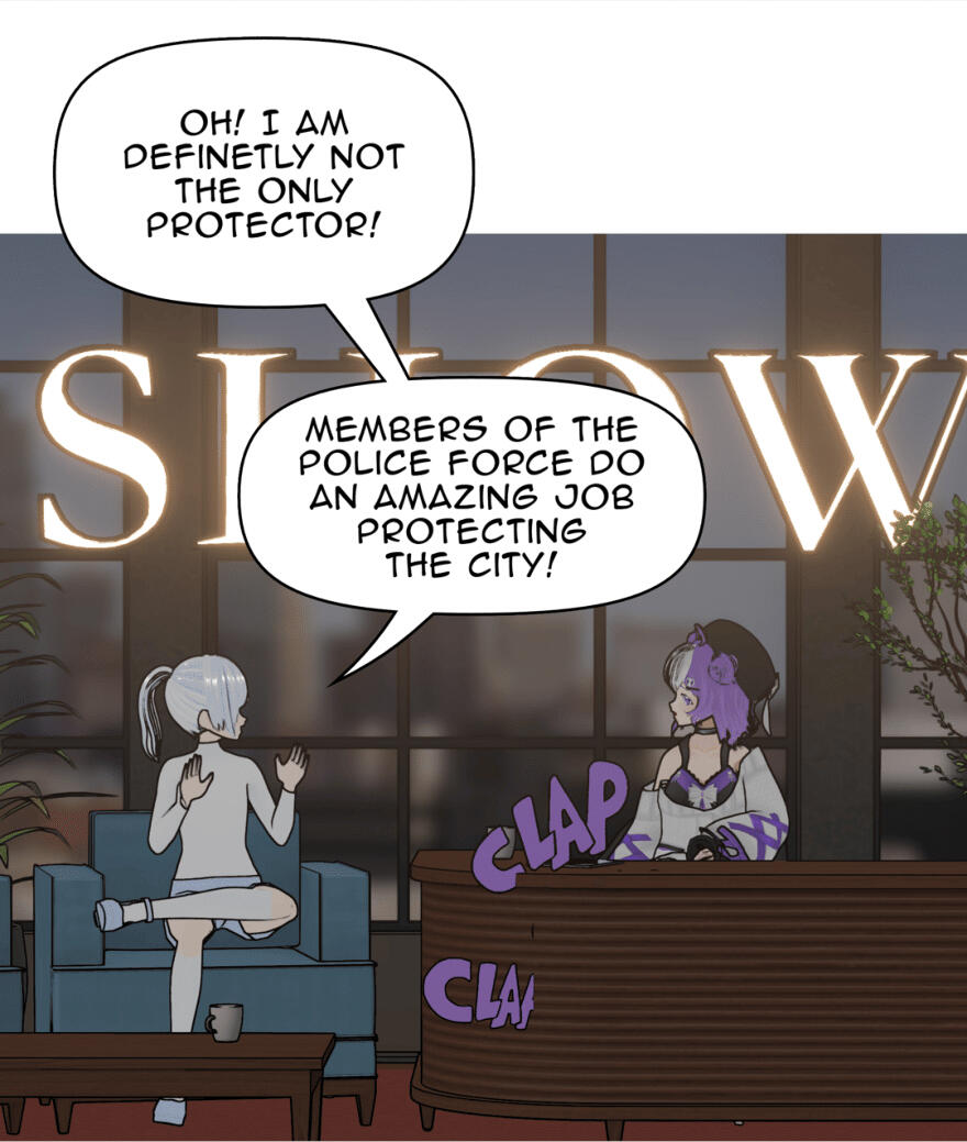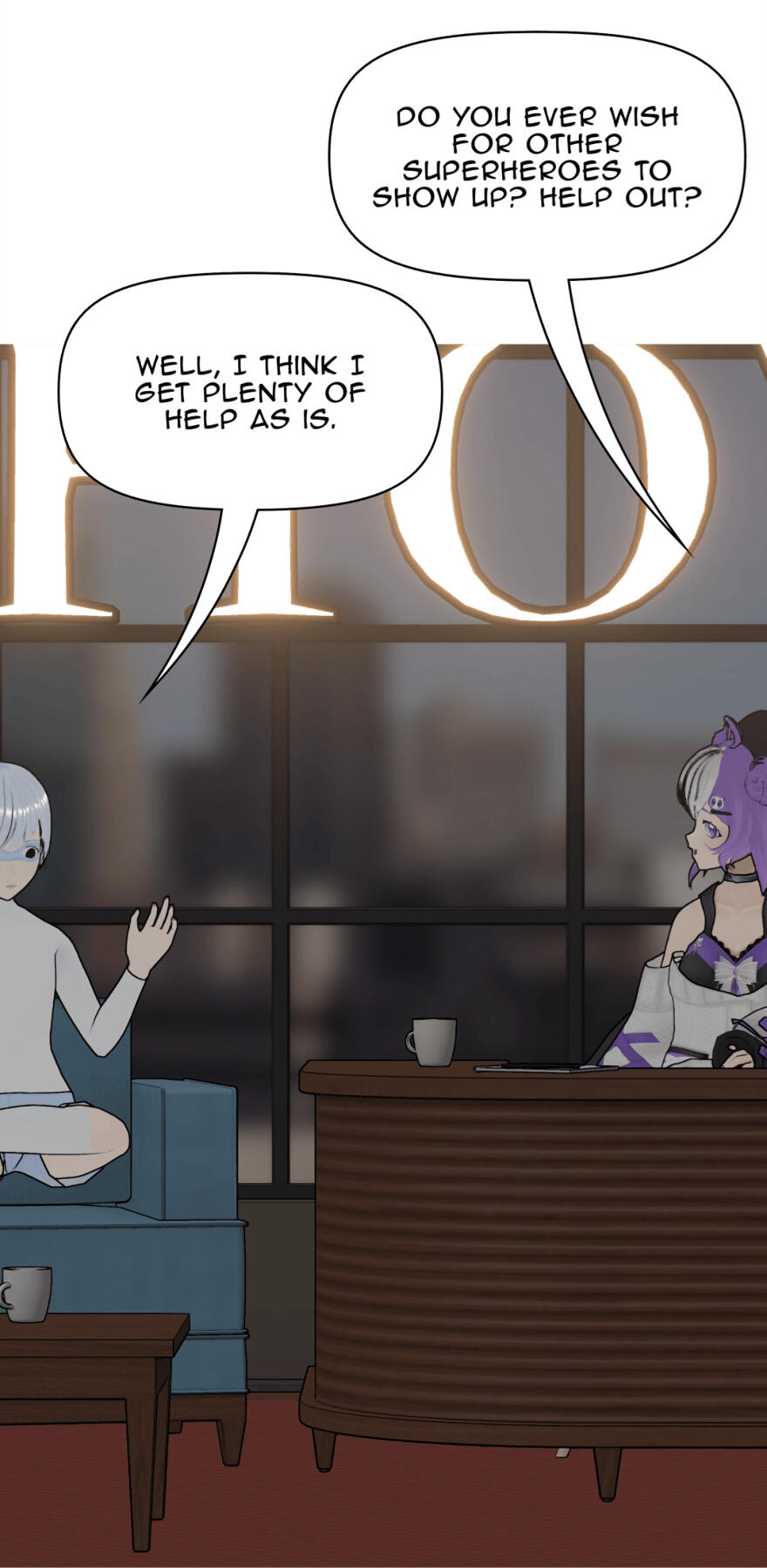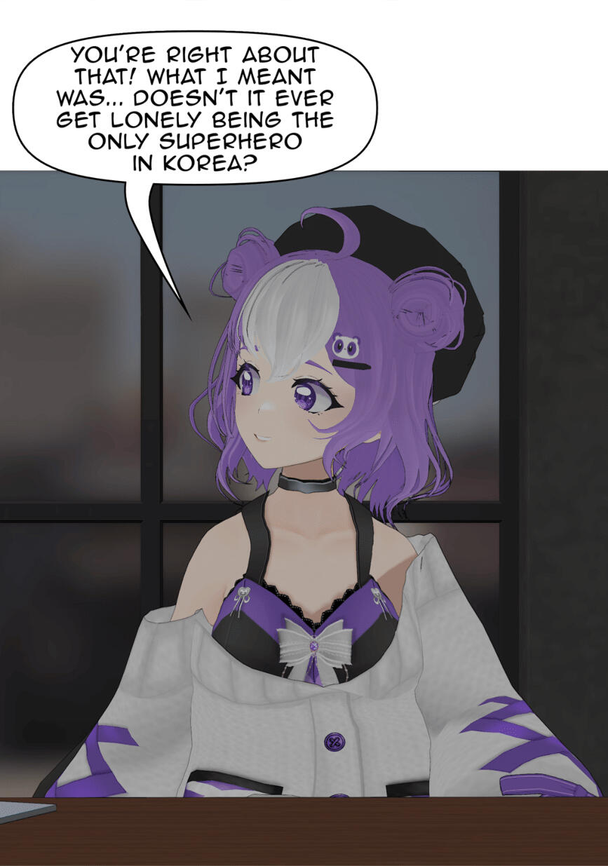 Luckily, today Eunjin managed to enter her house and change her clothes without any comments from her mother. She went to the kitchen to grab something to eat. On the fridge door she found a note from her parents.Out. Work trip. Back at 8.No dinner in the fridge of course. But at least she could wait before taking a shower. Her brother wouldn’t snitch on her for the hair dye. Eunjin settled for a store bought meal from about two weeks ago. It’d work. She set the microwave on for ten minutes and turned on the news. MP had hoped that the noise of the TV would cancel out her thoughts about today. It didn’t work that well.It’s been about two weeks since Velocity joined their superhero group. And it’s not like MP was mad about it, it was just different then she hoped. When she met Velocity she thought that it’d be the same as it was with the invisible girl. Maybe this time MP would take on the teacher role and show Velocity how to be a good hero, like the invisible girl did for her! She’d be a teacher! And then they’d be friends. Fight crime together, text on the app sometimes and that’s about it.What MP hadn’t thought about is that it wouldn’t go like that at all. Velocity wants to hang out. So much. All the time. Every time they’re done catching criminals she wants to do things. Food. Games. Movies. MP didn’t want that. She’d much rather things stay as they were. Saying bye after the criminal is caught and maybe occasional text messages after. She didn’t wanna hang out. It seemed like too much. Too many things to do. She didn’t want more responsibilities, more events to attend. MP didn’t want to admit it to herself, but she felt sad when she noticed that the invisible girl slowly started talking less and less with her, but more with Velocity. She felt annoyed. She needed a distraction. When the microwave rang, Eunjin took out her meal and ran upstairs. She knocked on her brother’s door.“Wanna game?” another knock “Or a movie?”Silence. Eunjin slowly pushed the door open. The room was empty. Did her brother actually go to football? She took her phone out.[Eunjin] Where are you? (┬┬﹏┬┬)[Eunwoo] Out.[Eunjin] ???[Eunwoo] Groceries.[Eunjin] OkayWell, hanging out with her brother is obviously out of the question. She went back downstairs and sat in front of the TV, slowly eating her meal. Maybe she could watch a movie alone. That could be nice too. Eunjin was about to turn to a different channel when she heard the news speaker.“In a shocking turn of events, it appears as though Seoul has gotten its very first supervillain. Let’s hear more from our reporter at the scene”“Thank you. Yes. That’s true. Nearby the mall on Mokdong-ro a man has been spotted throwing around vehicles. The passersby are in panic. What’s worse is that the local hero, MP, is nowhere to be seen. Currently we can observe the new hero, who goes by Velocity, trying to save as many people out of the vehicles as she can. This is a very dangerous situation and everyone’s hoping that MP will soon come to our rescue”What the fuck? Her phone rang.“Pia! You gotta come and help us out here! We’re at the mall at… uh…” she heard a panicked voice of her friend.“Yeah, I know. I saw the news. I’ll be there in ten” she hung up and ran upstairs to get changed for the second time today.Pia got ready as fast as she could and soon enough she was in the mall's parking lot. She spotted Velocity and waved at her.“Oh, thank god you're here. I’m trying to get as many people out of here as I can” Velocity said, pointing at the man in front of them “But that?! That's weird!”“Yeah, I know. Where's the other one? She called me”“She trying to sneak up behind the guy, attack him from behind”“Okay, you continue helping people out of the street, I'll check the guy out” Pia said as she got closer to the man.Velocity got back to helping people off the street and into the parking lot. Pia started to slowly approach the man.“What do you want?!” she yelled when she got close enough for him to hear “Who sent you here?!”The man ignored her and continued angrily smashing the vehicles. As Pia walked closer she noticed that the man didn’t look native to the area. It didn't surprise Pia much, this city was known for high levels of tourism and immigration.“Calm down, we talk, yes?” she asked, this time in English. The man still“Psst” Pia heard a noise coming from nearby “Over here!”“Hi, honey. Do you know what’s up with that guy?” Pia asked when she reached her friend.“All I know is that he’s very angry and doesn’t speak a word of Korean. I’ve got no idea how he’s doing that thing with the cars, it’s so bizarre” she explained.“I’m confused too, I’ve never heard of anything like this before. Okay, you try to sneak up behind him, I’ll distract him” Pia got up and stood in front of the man. Before she got a chance to say anything, a figure of a foreign girl appeared in front of her.“Nossa, é aí que você está. Demorou demais para te achar[1]” what? “I can take over from here, you can go sit down”“What?”“He's my villain, go sit” said the girl. Pia was so surprised and confused about the whole ordeal that she remained standing still. The foreign girl walked up to Pia and grabbed her by her hand. In a split second the view in front of them changed, they now stood a couple of meters to the side, away from the danger. Pia felt sick in her stomach, she left acid building up in her throat and knew she couldn't hold it in much longer.“What the fuck?”“Sorry, I'll explain later, okay?” said the stranger and she disappeared, quickly reappearing right behind the angry man. She hit him on the neck and he fell to the ground.“Wow” Pia heard coming from next to her “That- that was good”“Yeah. Crazy good”They watched as the foreign girl locked the man in handcuffs and disappeared again. When she 